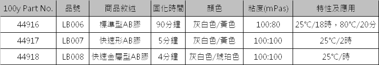 雙劑型環氧樹脂AB膠,廣泛應用於家庭五金零件如門窗、皮鞋、杯子、手把等之修理及接著,對於多種材質如皮革、金屬、塑膠、陶瓷及玻璃,均具有良好接著效果,小容量包裝,使用方便。