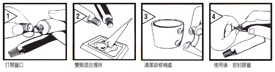 清潔欲修理及接著處之表面,去除油漬及溶劑並保持乾燥,將表面輕微研磨,塗以適量已混合之接著劑,須按其操作時間結束前塗膠完成,將欲接著勿以夾具、膠帶或重壓方式使其緊固,避免膠水接觸眼睛或皮膚,若不慎接觸皮膚,須立即以溫水及肥皂清洗。使用完產品後須將白色瓶蓋鎖緊,以增加產品保存品質。