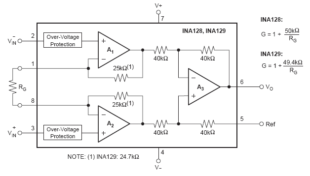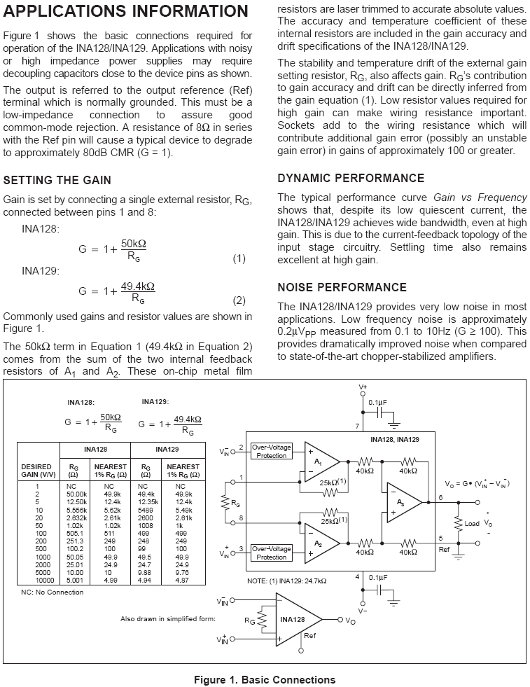 A single external resistor sets any gain from 1 to 10,000. The INA128 provides an industry-standard gain equation; the INA129 gain equation is compatible with the AD620.