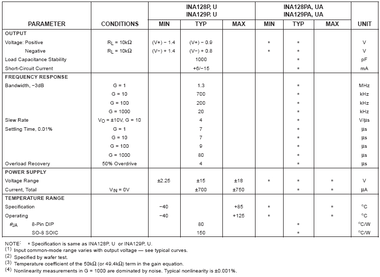 The INA128/INA129 is available in 8-pin plastic DIP and SO-8 surface-mount packages, specified for the –40°C to +85°C temperature range. The INA128 is also available in a dual configuration, the INA2128.