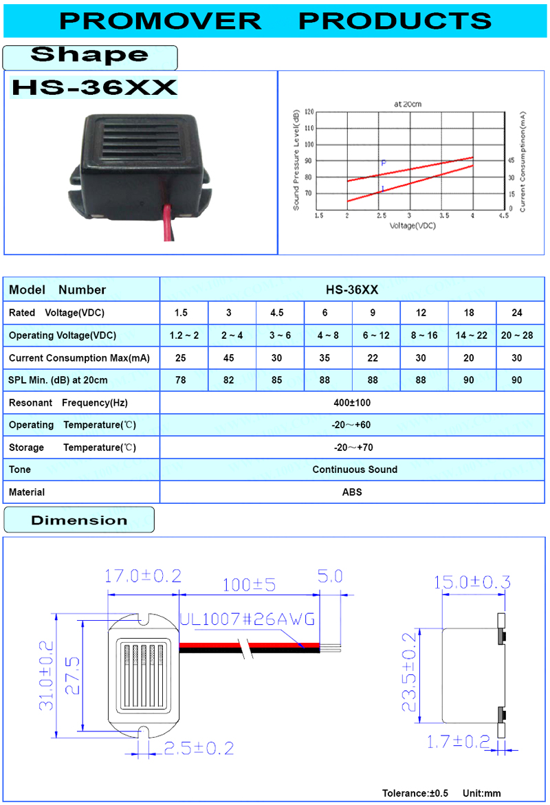 電磁式帶線蜂鳴器(自激式) HS-36XX