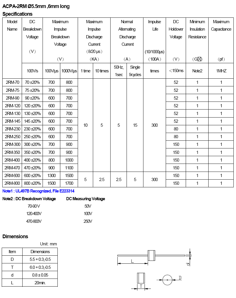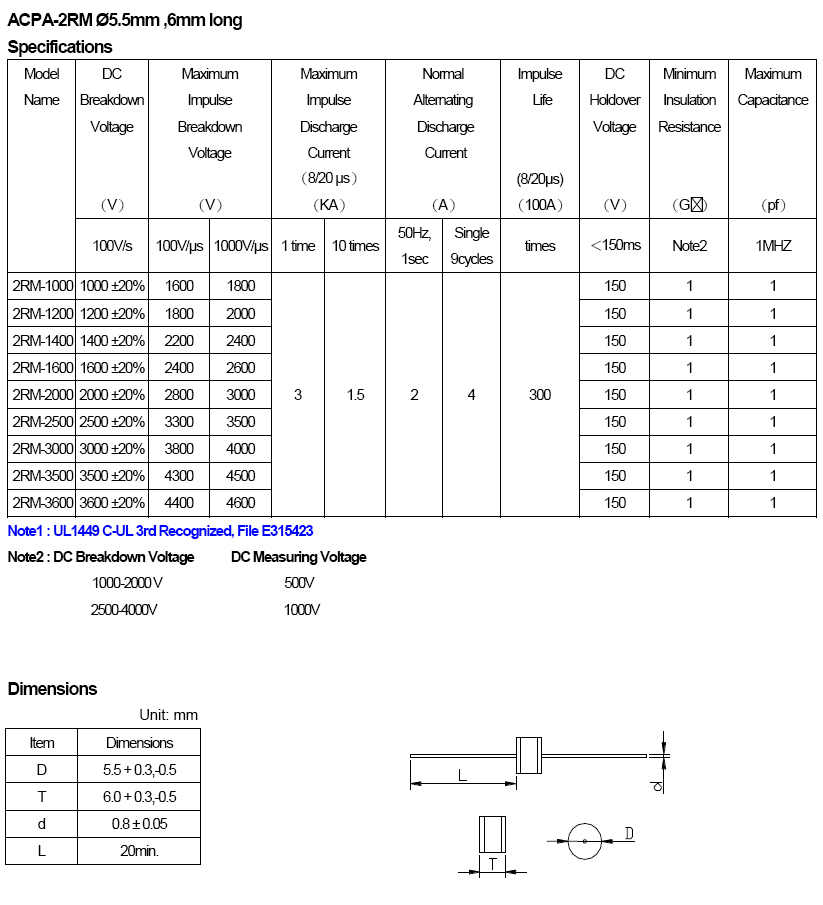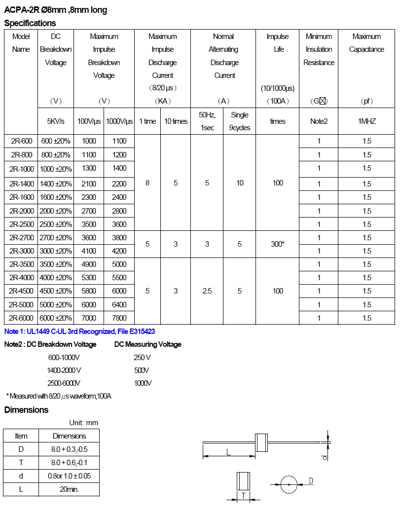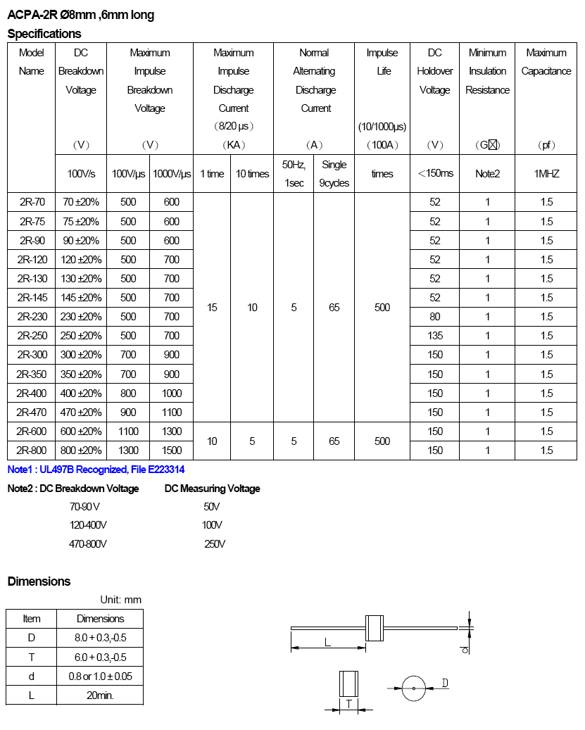 L=Axial Lead L1=1.0mm L2=0.8mm Diameter