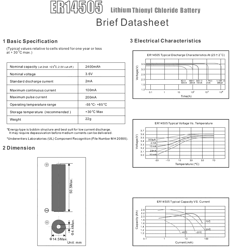 EEMB-3.6V鋰-亞硫酸氯電池ER14505-AX