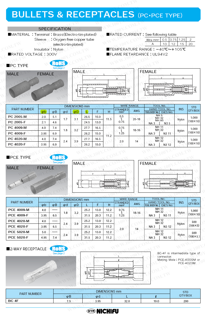 "NICHIFU"子彈形母端子20-18AWG 白ROHS