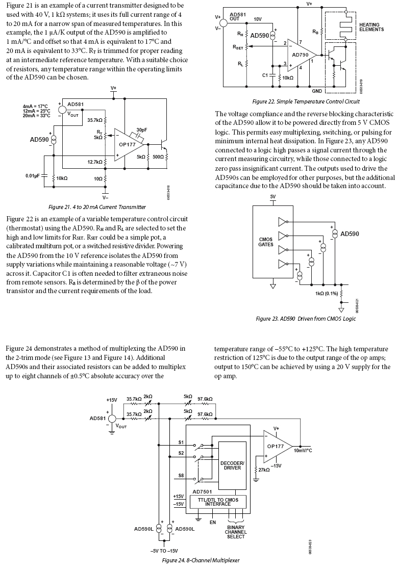 AD590特別適合遠端檢測應用。它提供高阻抗電流輸出,對長線路上的壓降不敏感。任何絕緣良好的雙絞線都適用,與接收電路的距離可達到數百英尺。這種輸出特性還便於AD590實現多工:輸出電流可以通過一個CMOS多工器切換,或者電源電壓可以通過一個邏輯門輸出切換。