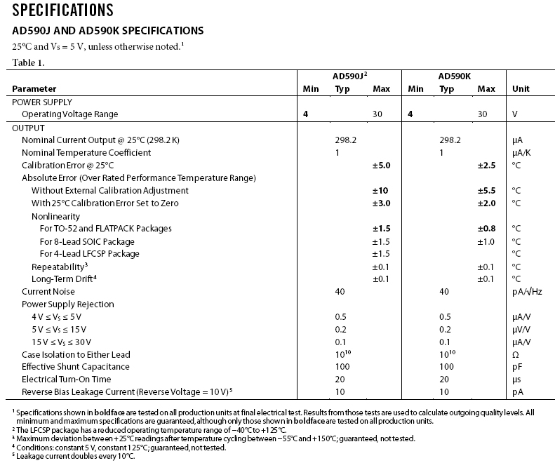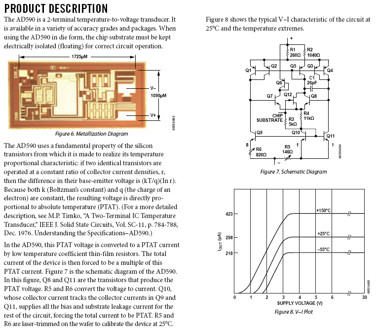 AD590是一款雙端積體電路溫度感測器,其輸出電流與絕對溫度成比例。在4 V至30 V電源電壓範圍內,該器件可充當一個高阻抗、恒流調節器,調節係數為1 µA/K。片內薄膜電阻經過鐳射調整,可用於校準器件,使該器件在298.2K (25°C)時輸出298.2 µA電流。