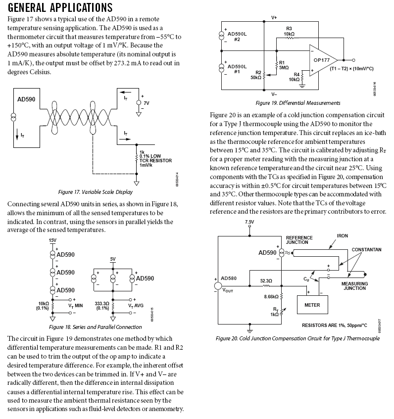 AD590適用於150°C以下、目前採用傳統電氣溫度感測器的任何溫度檢測應用。低成本的單晶片積體電路及無需支援電路的特點,使它成為許多溫度測量應用的一種很有吸引力的備選方案。應用AD590時,無需線性化電路、精密電壓放大器、電阻測量電路和冷結補償。