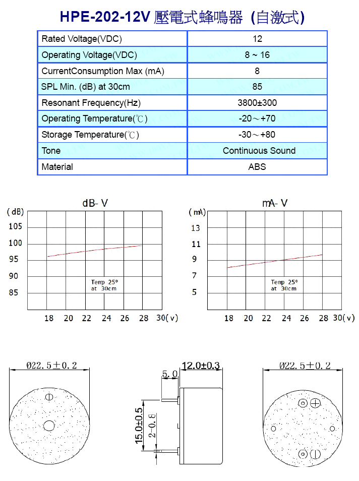 有源壓電式蜂鳴器(外激式) 12Vdc【ROHS】