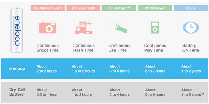 1.長備電池推薦物品。由於放電抑制性能,如先充電一年後約殘餘90%,五年後約殘餘70%。