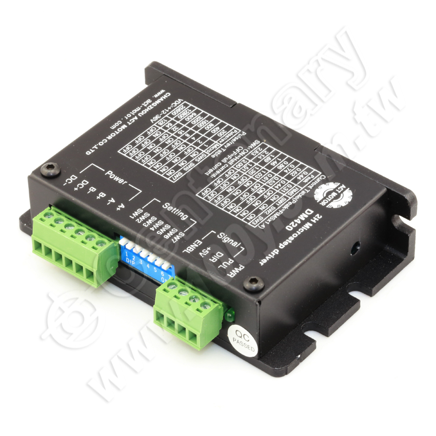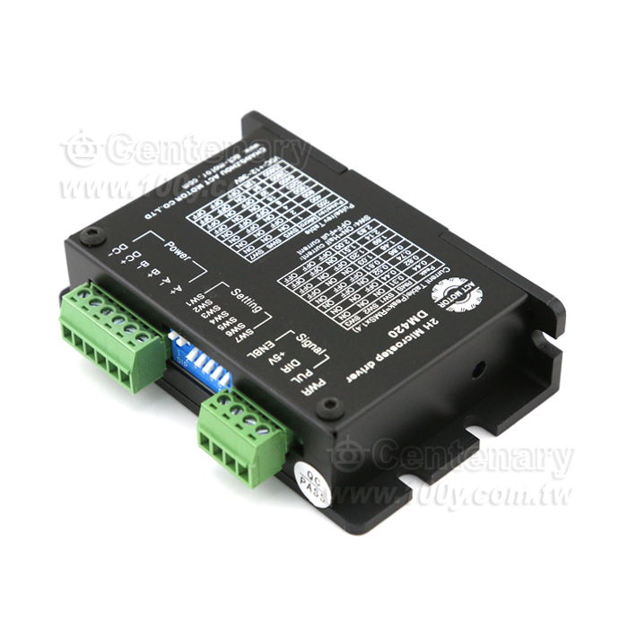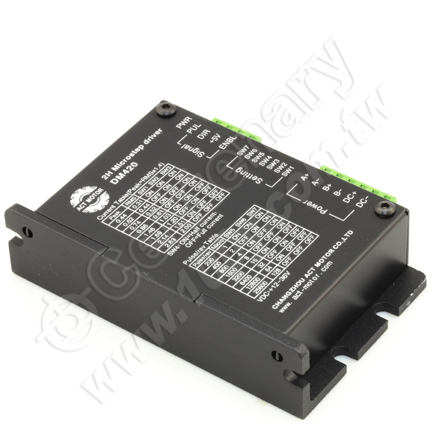 DM420 型細分型兩相混合式步進電機驅動器,採用直流12~36V 供電,適合驅動電壓24V~36V,電流小於2.0A 外徑42~57 毫米的兩相混合式步進電機。此驅動器採用全數位電流環進行細分控制,電機的轉矩波動小,低速運行平穩,振動和噪音低。高速時可輸出相對較高的力矩,定位精度高。廣泛適用於雕刻機、數控機床、包裝機械、傳動設備等分辯率要求較高的設備上。