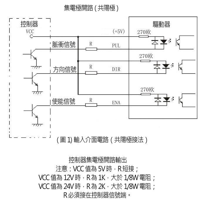上位機的控制信號可以高電平有效,也可以低電平有效。當高有效時,把所有控制信號的負端連在一起作為信號地,低有效時,把所有控制信號的正端連在一起作為信號公共端。現在以集電極開路為例,介面電路示意圖如下: