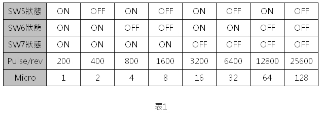 SW5、SW6、SW7 位來設置驅動器的步數(Pulse/rev)如表1: