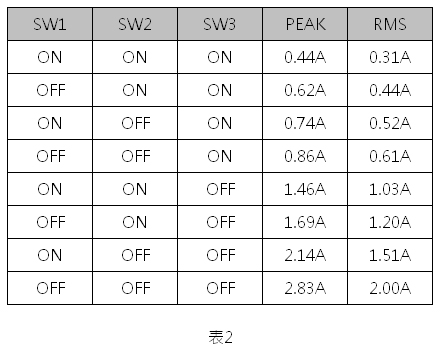 為了驅動不同扭矩的步進電機,用戶可以通過驅動器面板上的撥碼開關SW1、SW2、SW3 位來設置驅動器的輸出相電流(有效值)單位安培,各開關位置對應的輸出電流,不同型號驅動器所對應的輸出電流值不同。具體見表2。