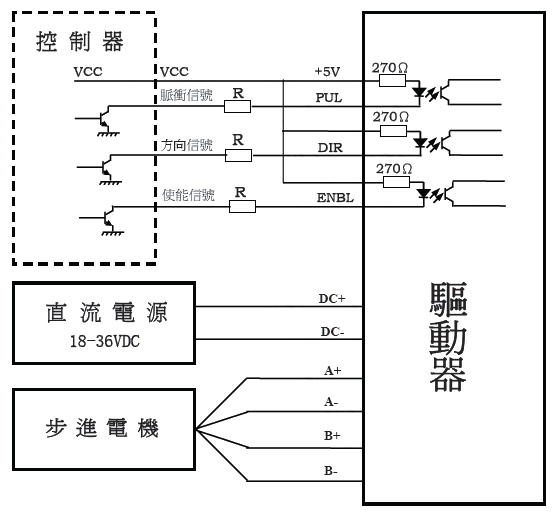 一個完整的步進電機控制系統應含有步進驅動器、直流電源以及控制器(脈衝源)。以下為典型系統接線圖: