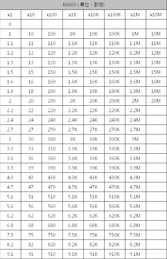 R0603貼片電阻樣品本詳細清單