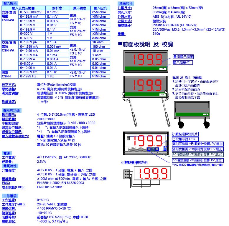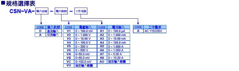 | CSN-VA | 交流/直流電壓 0~150V, 0~300V, 0~600V (指定) 或 交流/直流電流 0~1A, 0~5A (指定), 直流分流器 0~50mV, 0~60mV, 0~100mV |