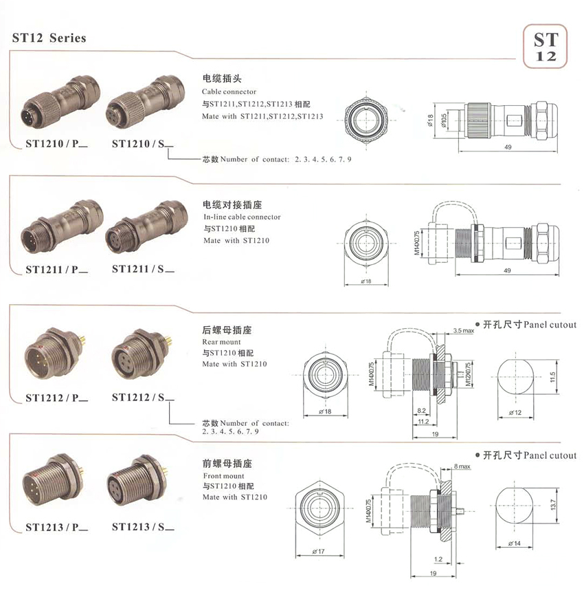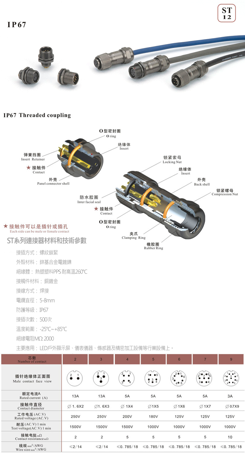 圓形螺紋鎖緊式 電纜連接器 ST12系列