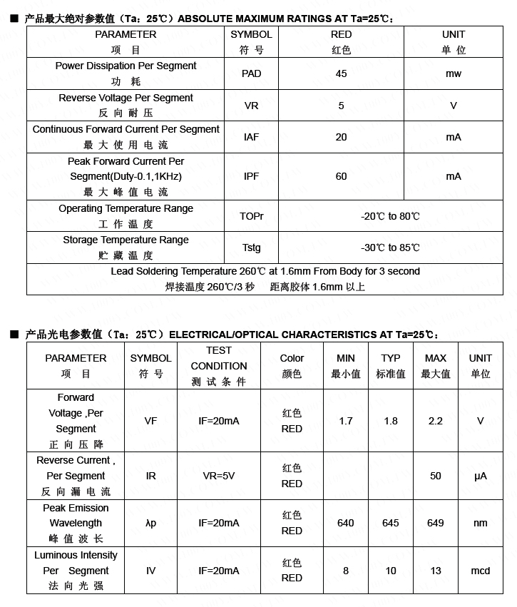 0.8" 高亮紅色645nm/1.8Vf/10mcd
