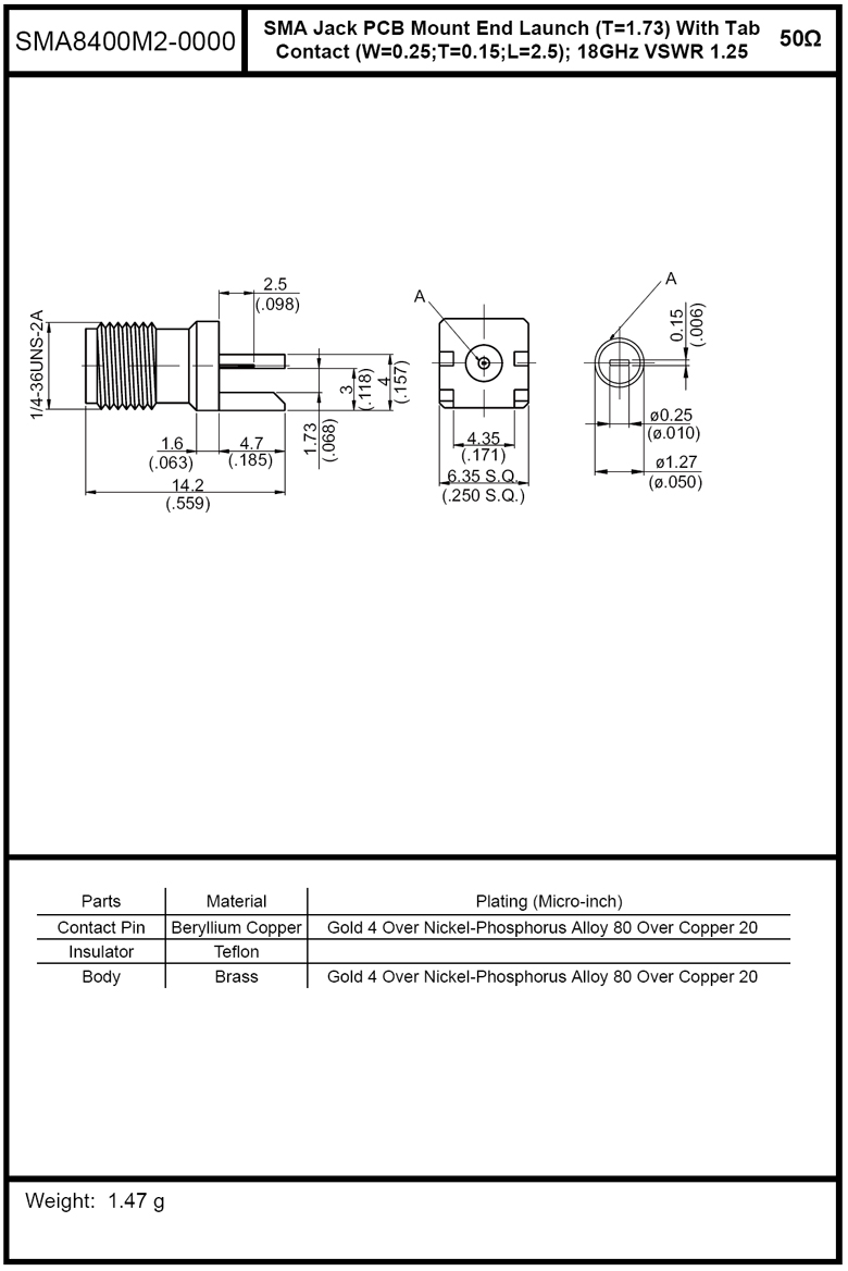 SMA Jack 適合1.6mm厚板材 18GHz VSWR1.25