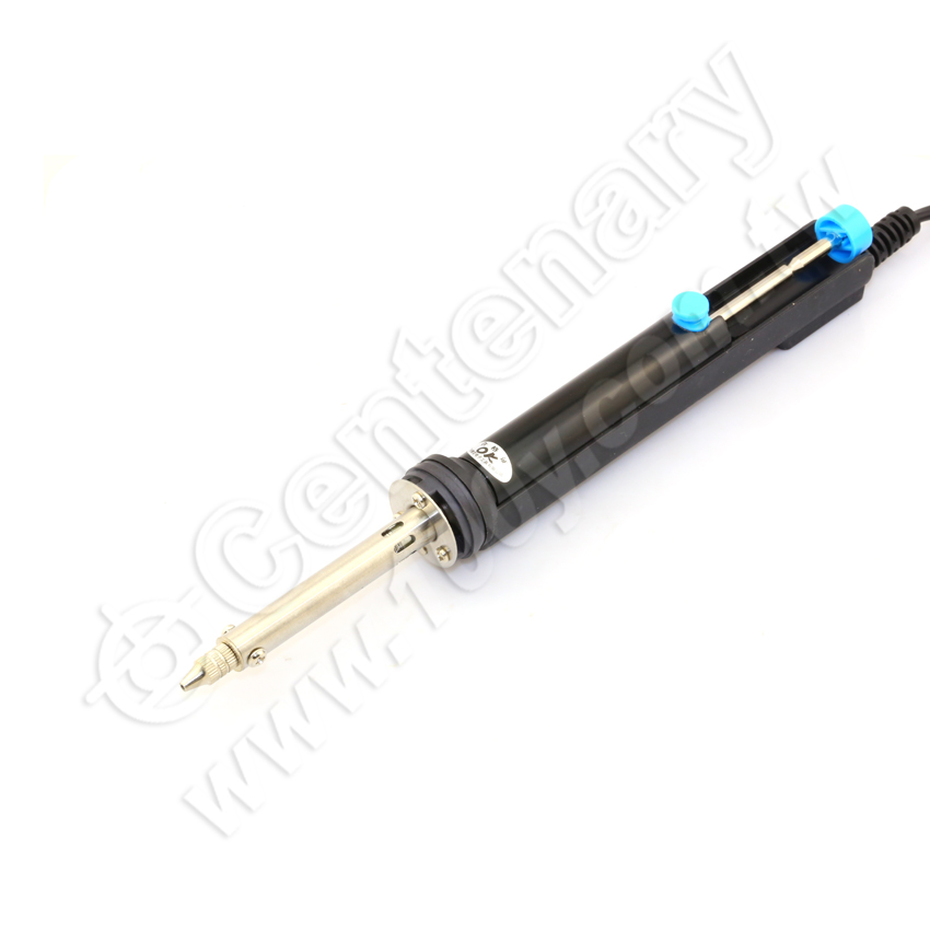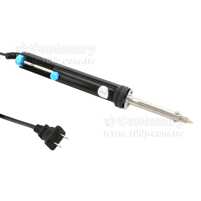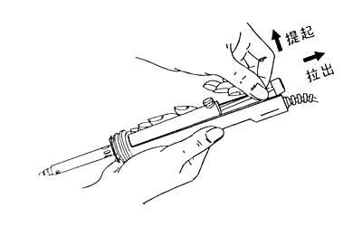 ●將活塞柄推下卡住,吸錫器吸嘴前端部對準欲去下元件的焊點,待焊錫溶化後,按動定位按鈕,焊錫即被吸進進氣筒內