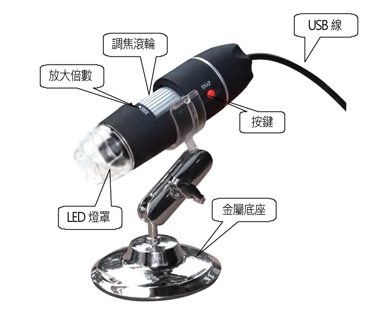 ●內含:數碼顯微鏡主體×1,USB連接線(1.5m)×1,方向底座×1,光碟片×1