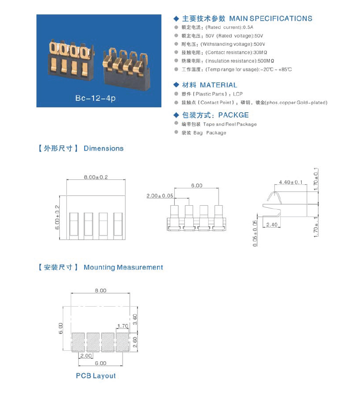 Bc-12-4p 電池連接器 4P/2.0mm 鍍金