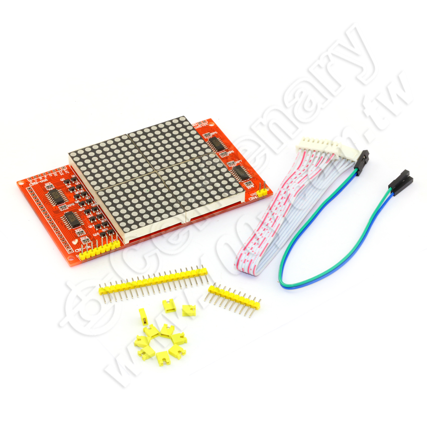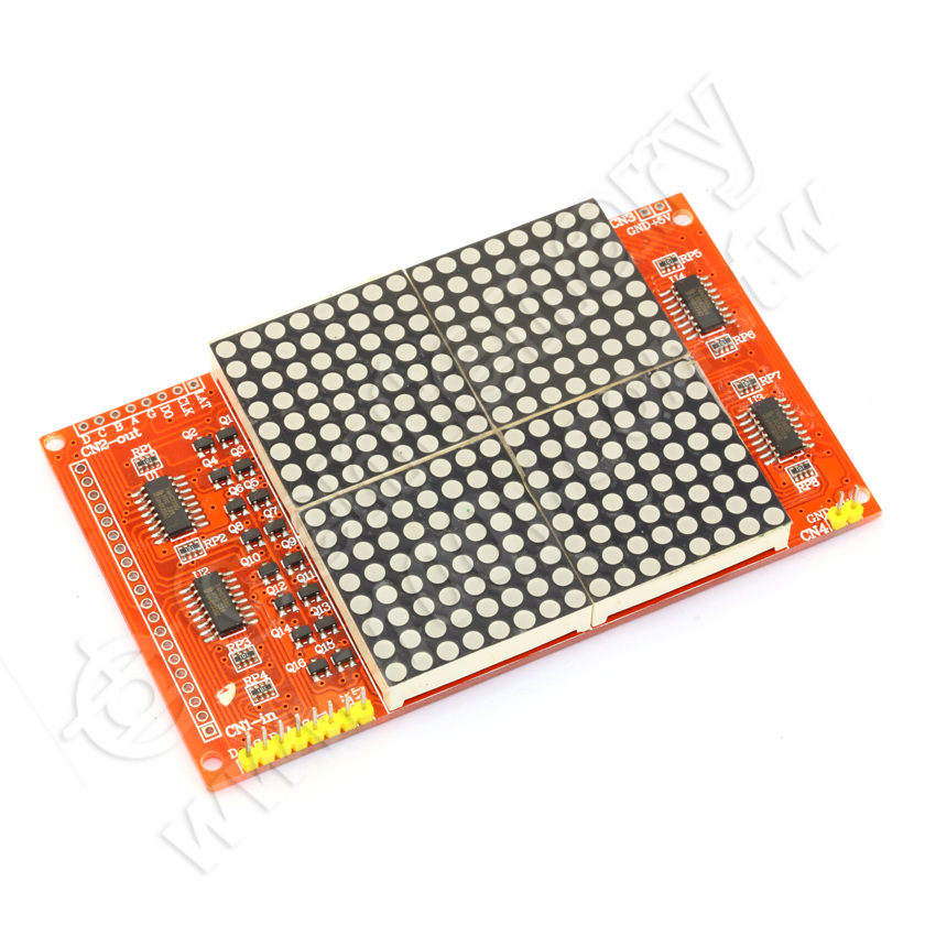 電路板為雙面PCB 版,元件焊接,模塊由4 個點陣LED、2 個串入並出芯片74HC595 為列控制、2 個譯碼芯片74HC138 為行控制組成,同時保留8 個控制端口通過插針引出,用戶可以使用杜邦線或其他連接線連接到單片機上控制使用。