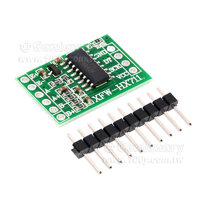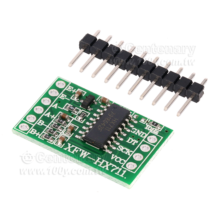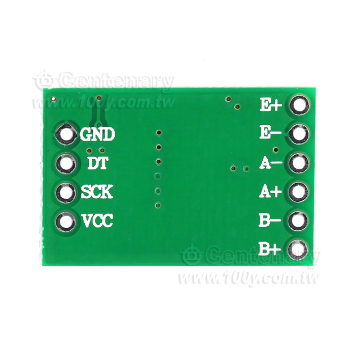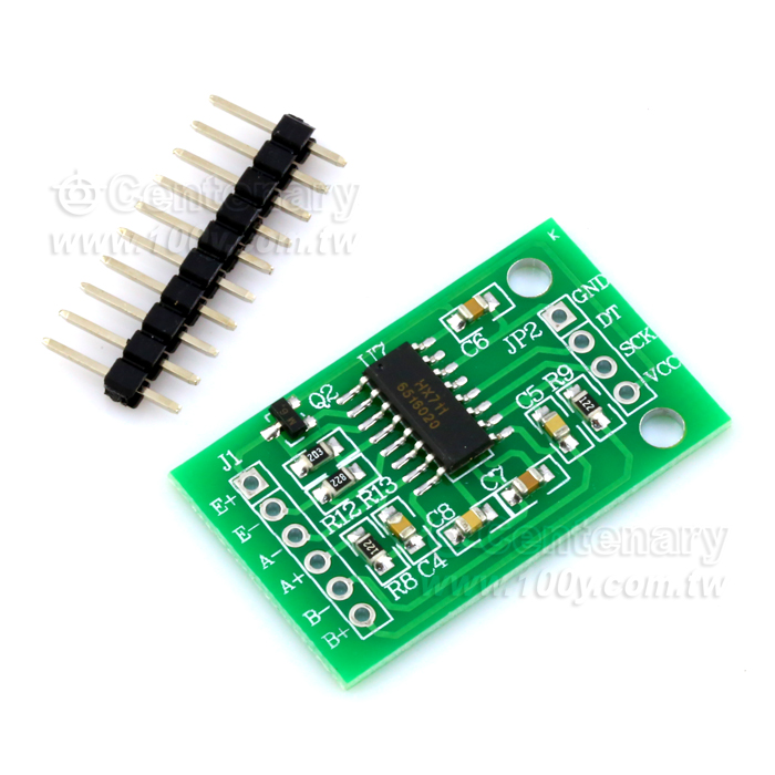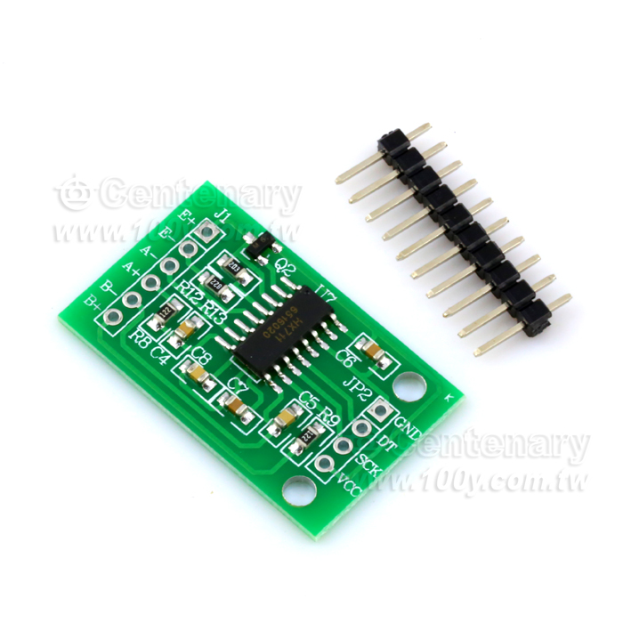 本模組採用 24 位元高精度的A/D 轉換器晶片hx711,是一款專為高精度電子稱而設計的,具有兩路模擬通道輸入,內部集成128 倍增益可編程放大器。輸入電路可配置為提供橋壓的電橋式(如壓力、稱重)感測器模式,是一款理想的高精度、低成本採樣前端模組