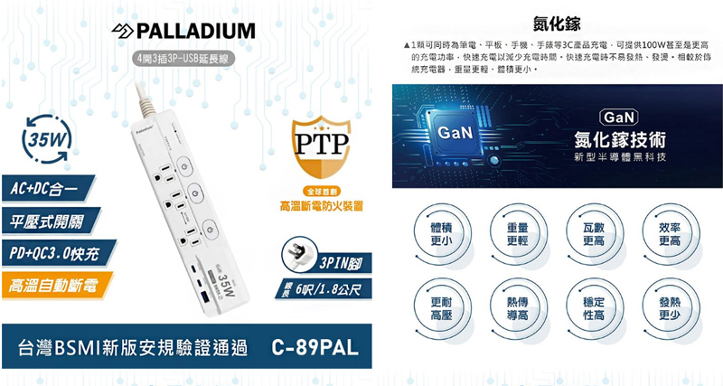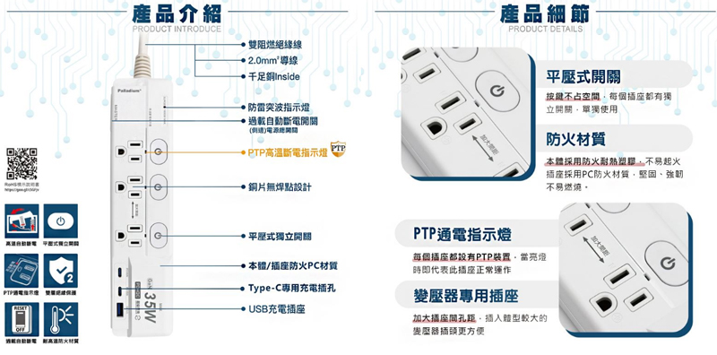 按壓式4開3插3P/PD+QC延長線 1.8M