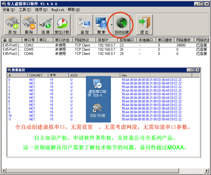 全新虛擬串口軟件,簡單到您無法想像:第一步連接硬體並供電,第二步點擊自動創建按鈕,第三步,使用您的軟件調用創建成功的虛擬串口進行使用。