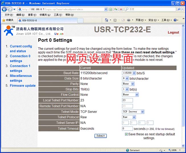 下圖為網頁設置介面的截圖,USR-TCP232-E 支援網頁設置,簡單穩定!
