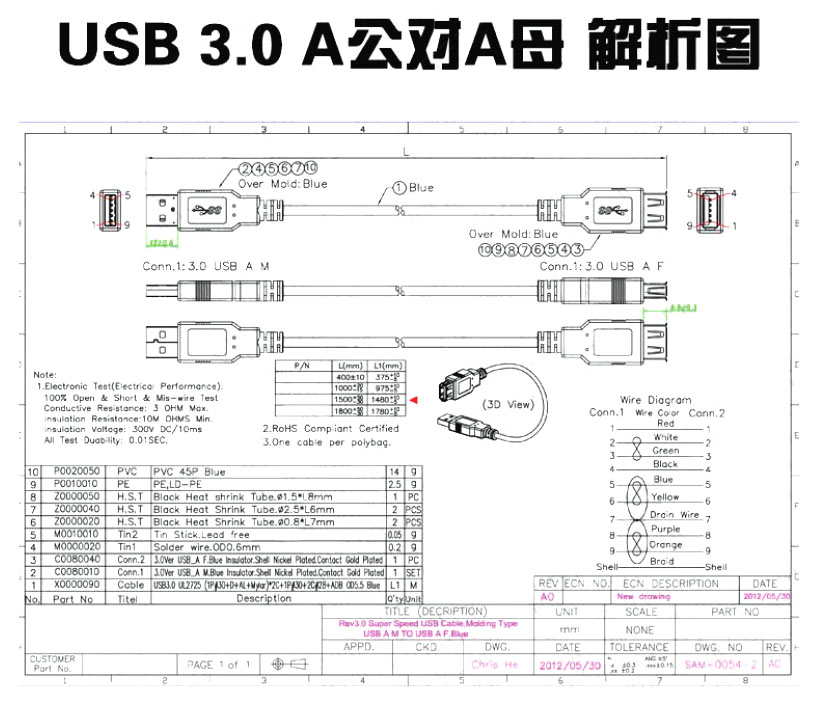 USB 3.0 A公/A母 傳輸線 1M【ROHS】