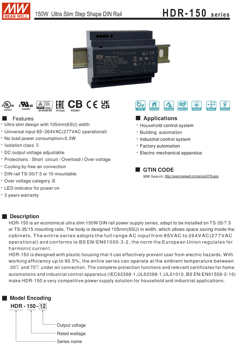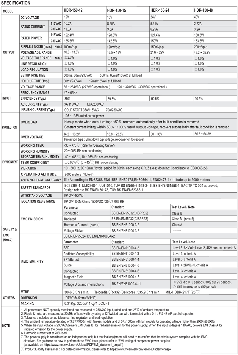 MW_HDR-150 系列 電源供應器