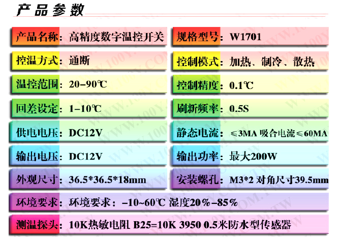 W1701 精密溫控器控溫開關可調溫度開關溫控開關溫度回差可變 • 型號: W1701 • 貨號: W1701 • 顏色分類: 另購10 米探頭另購 1 米探頭另購 2 米探頭另購 5 米探頭主機板 + 0.5 米探頭 • 工作原理: 電子式溫控器 • 功率: 250V10A 溫控器溫度範圍: 110 ℃