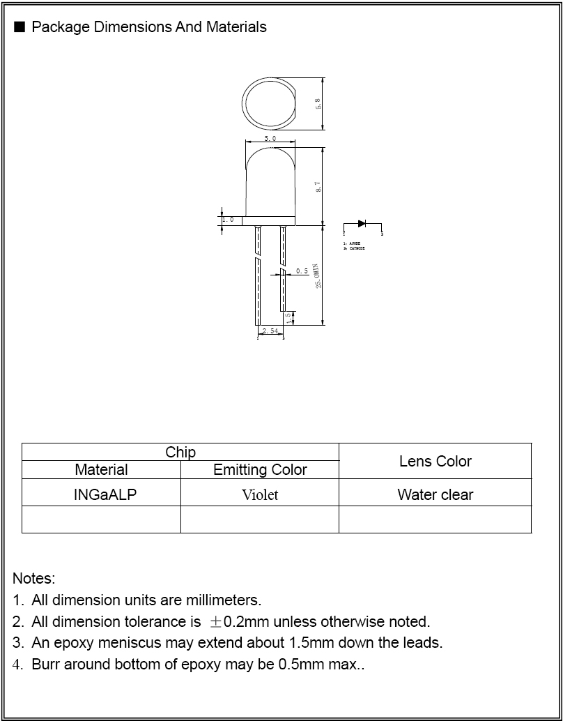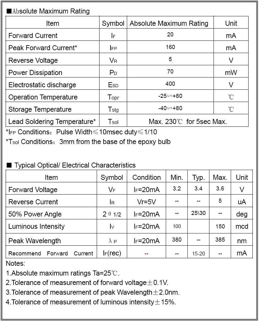 ψ5 圓頭紫光LED 0.06W 380~385nm 長腳